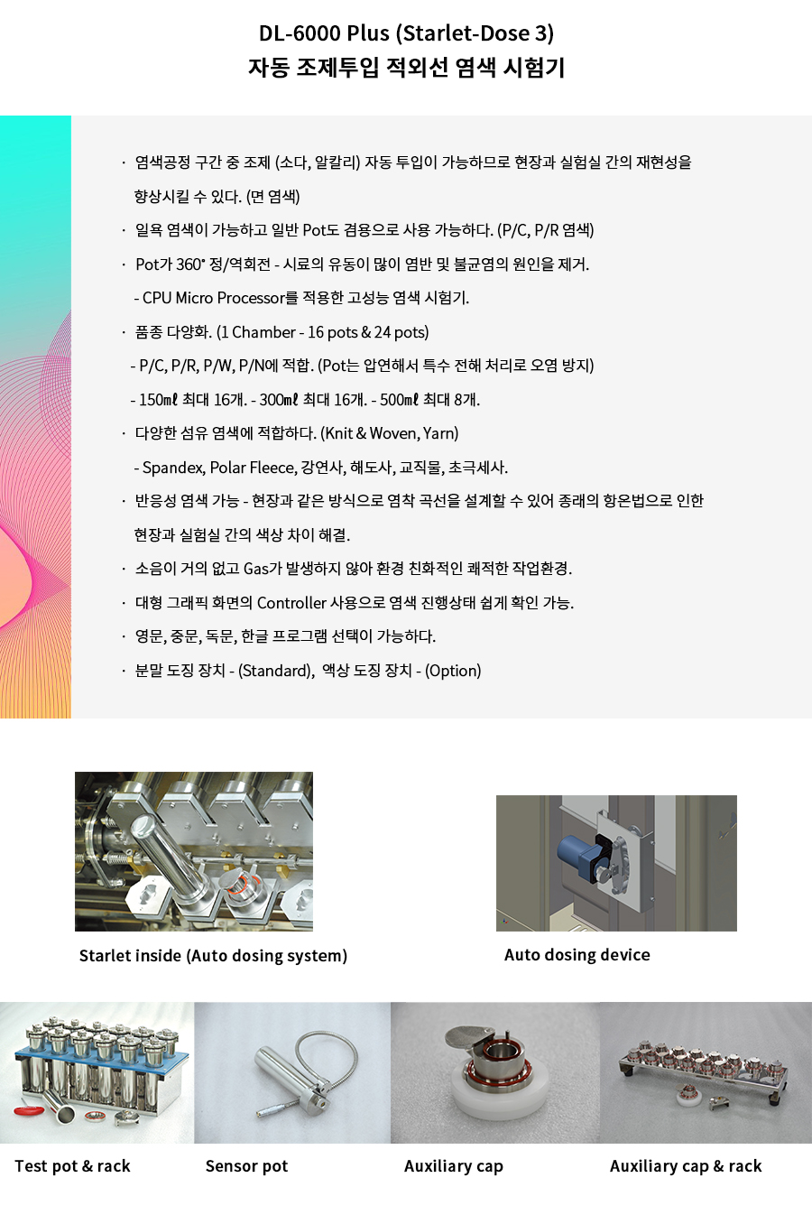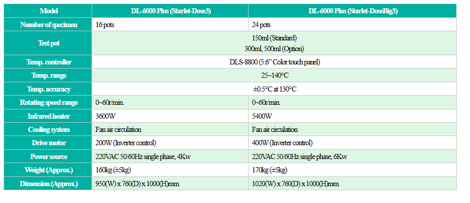 The DL-6000 Plus (Starlet-Dose3 / Starlet-DoseBig3) is an advanced laboratory dyeing machine with an integrated dosing concept, designed for precise and repeatable sample dyeing. The Starlet-Dose3 supports 16 pots, while the Starlet-DoseBig3 handles 24 pots, using 150ml test pots as standard with 300ml and 500ml options available. Featuring a 5.6” color touch panel controller, a 25–140°C temperature range, and ±0.5°C accuracy, it delivers excellent process control. With infrared heating, fan air cooling, and inverter-controlled rotation, this system is ideal for high-efficiency textile laboratory applications.