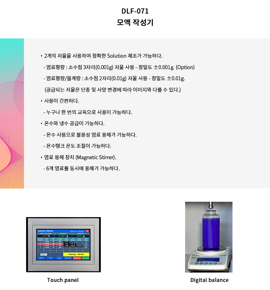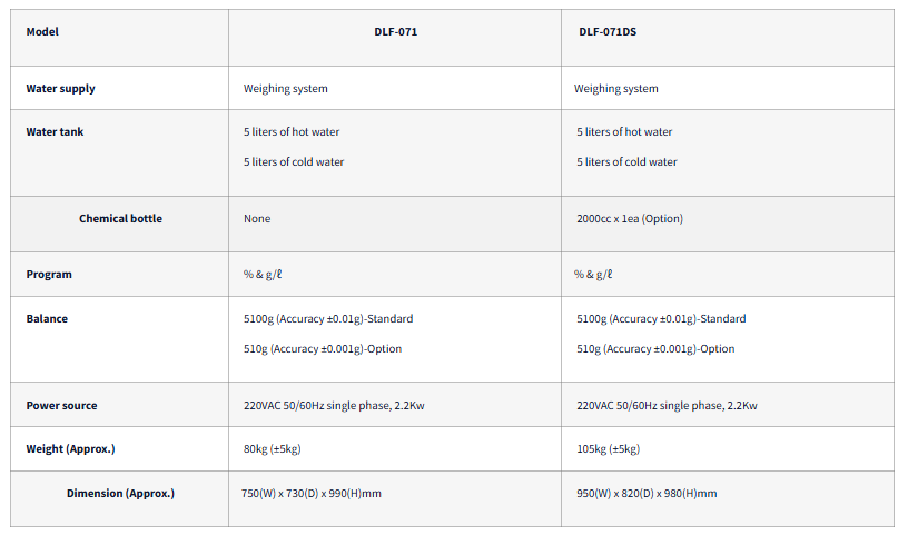 The DLF-071 / DLF-071DS is a compact water supply and weighing system designed for accurate laboratory dosing. It features separate 5-liter hot and cold water tanks, programmable dispensing in % and g/ℓ, and a high-precision weighing balance. The DLF-071DS includes an optional 2000cc chemical bottle for added flexibility. Powered by 220VAC single-phase (2.2kW), it is ideal for precise and efficient laboratory operations.
