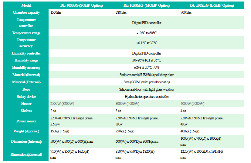 ย Dimension (Internal) ย 500(W) x 500(D) x 600(H)mm ย 600(W) x 600(D) x 800(H)mm ย 1000(W) x 700(D) x 1000(H)